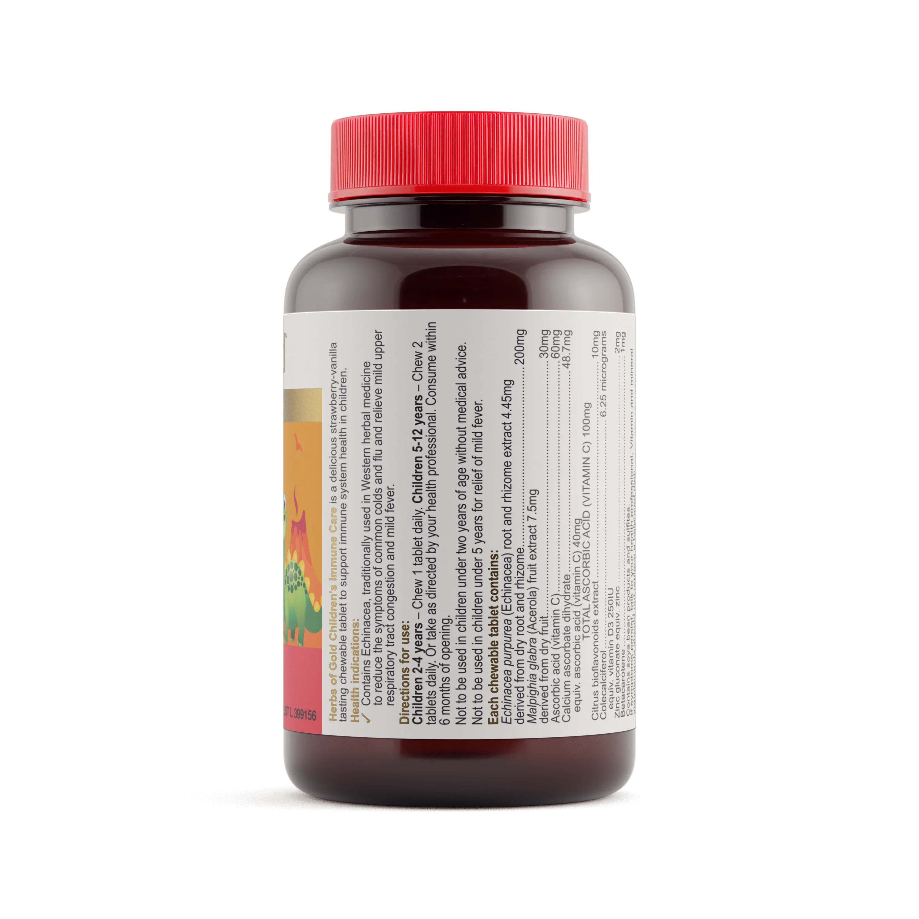 Herbs of Gold Children’s Immune Care is a delicious strawberry-vanilla chewable tablet formulated to support healthy immune system function and help fight illness in children. This blend of herbs, vitamins, and minerals is a simple, no-fuss way to support your child's immune health, especially during cold and flu season.