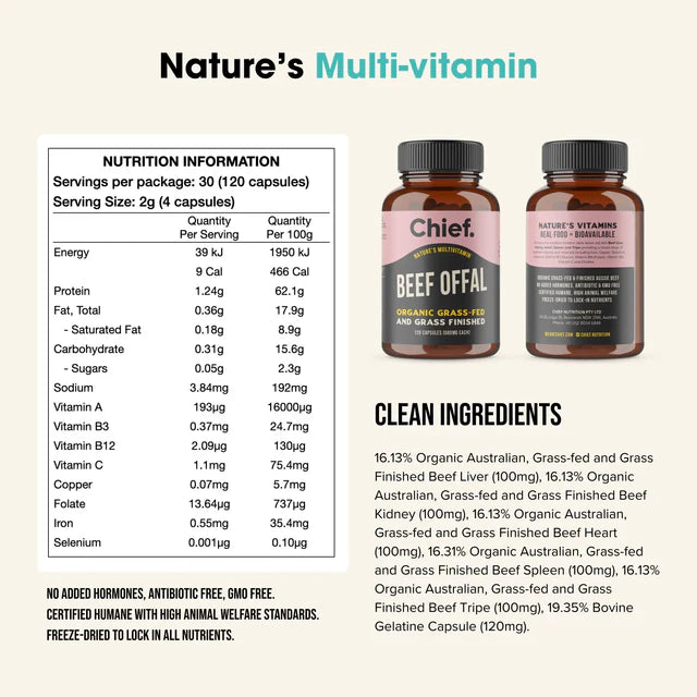 Put back the nutrients modern diets leave out with Beef Liver, Kidney, Heart, Spleen and Tripe providing a broad range of essential vitamins and minerals including Iron, Copper, Selenium, Vitamin A, Vitamin B3 (Niacin), Vitamin B9 (Folate), Vitamin B12, Vitamin C and Choline. Not many people like the taste of organ meats so this encapsulated product enables you to get the benefits without the taste!