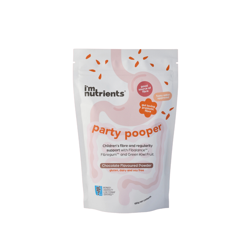 I’m Nutrients Party Pooper is a gentle, chocolate-flavoured, Low FODMAP–certified fibre supplement designed to support regular bowel movements in children and teens without upsetting sensitive digestion. Assessed by Monash University for FODMAP content, each serve provides 4g of fibre from two well-tolerated prebiotic fibres—partially hydrolysed guar gum (PHGG) and acacia fibre—plus real kiwifruit powder to support regular laxation. It’s super easy to include in a child’s daily routine.