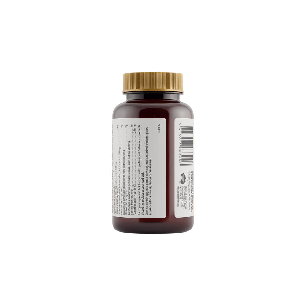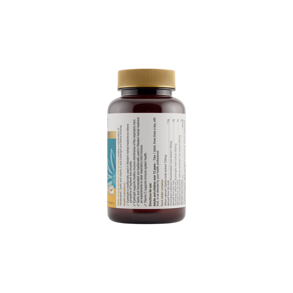 Herbs of Gold Hayfever & Sinus Ease is a comprehensive, high-strength formula traditionally used in Western herbal medicine to relieve symptoms of hayfever and sinusitis. It contains eyebright to support healthy mucous membranes of the respiratory tract and help relieve cough and reduce bronchial mucous congestion. Garlic and horseradish are traditionally used as expectorants to help clear respiratory tract mucous, with horseradish also traditionally used as a decongestant to relieve nasal congestion. This formula also includes vitamin C, an antioxidant that supports immune system function and helps reduce free radicals formed in the body.