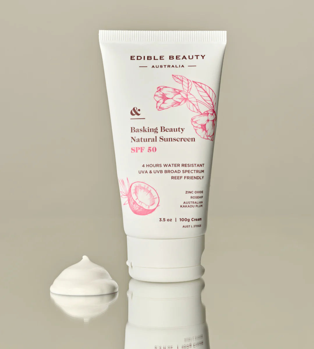 Edible Beauty Australia & Basking Beauty Natural Sunscreen SPF 50 is a luxurious, plant-based sunscreen offering broad-spectrum UVA and UVB protection using zinc oxide. This ocean-friendly, physical sunscreen glides effortlessly onto the skin while delivering deep nourishment and hydration. Enriched with vitamin E and rosehip oil, it supports skin health with antioxidant protection and age-defying benefits. Featuring calming camellia seed oil, this botanical formula hydrates, soothes, and protects without the irritation or hormone disruption associated with chemical sunscreens—making it a beautiful daily essential for sun care.