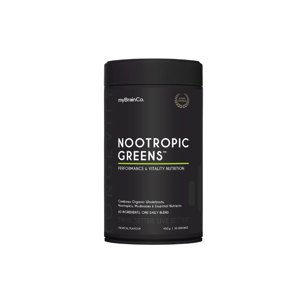myBrainCo. Nootropic Greens is an award-winning superfood blend designed to support energy, focus, and long-term vitality. Packed with organic whole-food nutrients, adaptogenic mushrooms, and advanced nootropic ingredients including NAC, MSM, Alpha-GPC, and Nicotinamide Riboside (NR), it nourishes both brain and body. This naturally flavoured powder is vegan-friendly, FODMAP-certified, and made with full ingredient transparency—no proprietary blends or hidden fillers—delivering clean, science-backed nutrition to support performance and longevity.