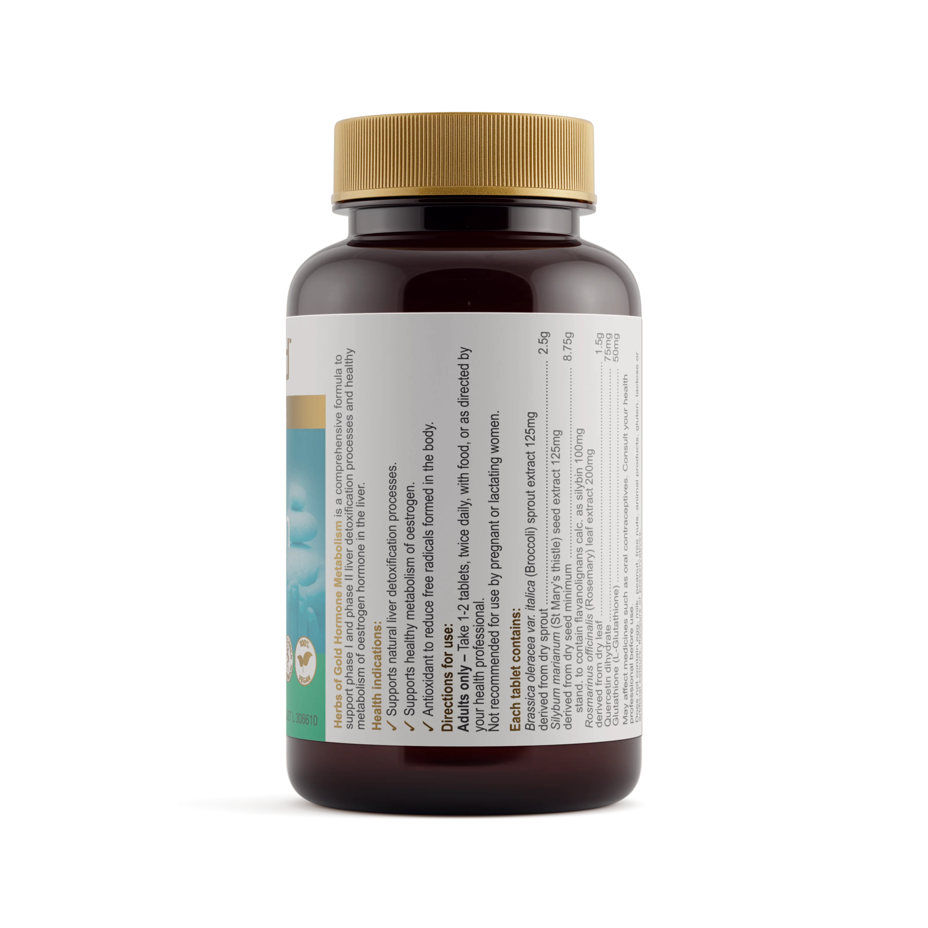 Herbs of Gold Hormone Metabolism is a comprehensive herbal and nutritional formula designed to support healthy oestrogen metabolism and liver detoxification. It combines key ingredients such as Broccoli sprouts and St Mary’s thistle to promote optimal phase I and phase II liver detoxification processes and maintain healthy liver function. St Mary’s thistle is traditionally used in Western herbal medicine to protect the liver, relieve symptoms of indigestion, and support overall liver health. The formula also provides antioxidant support to help reduce free radicals formed in the body, promoting hormonal balance and overall wellbeing.
