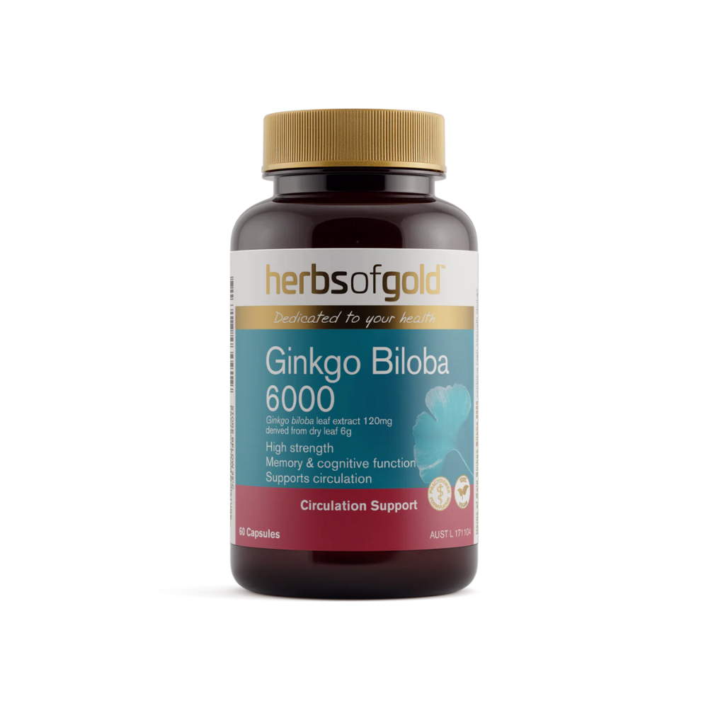 Herbs of Gold Ginkgo Biloba 6000 is a high-strength formula designed to support memory, cognitive function, and overall brain health. It contains Ginkgo biloba standardised to provide Ginkgo flavonglycosides, the active compounds believed to be responsible for many of Ginkgo’s beneficial effects. This powerful herb supports mental performance, concentration, and recall, while also promoting healthy blood circulation—particularly to the peripheral areas of the body such as the legs, hands, and feet. In addition, Ginkgo acts as an antioxidant, helping to reduce free radicals formed in the body and support cardiovascular and capillary health.