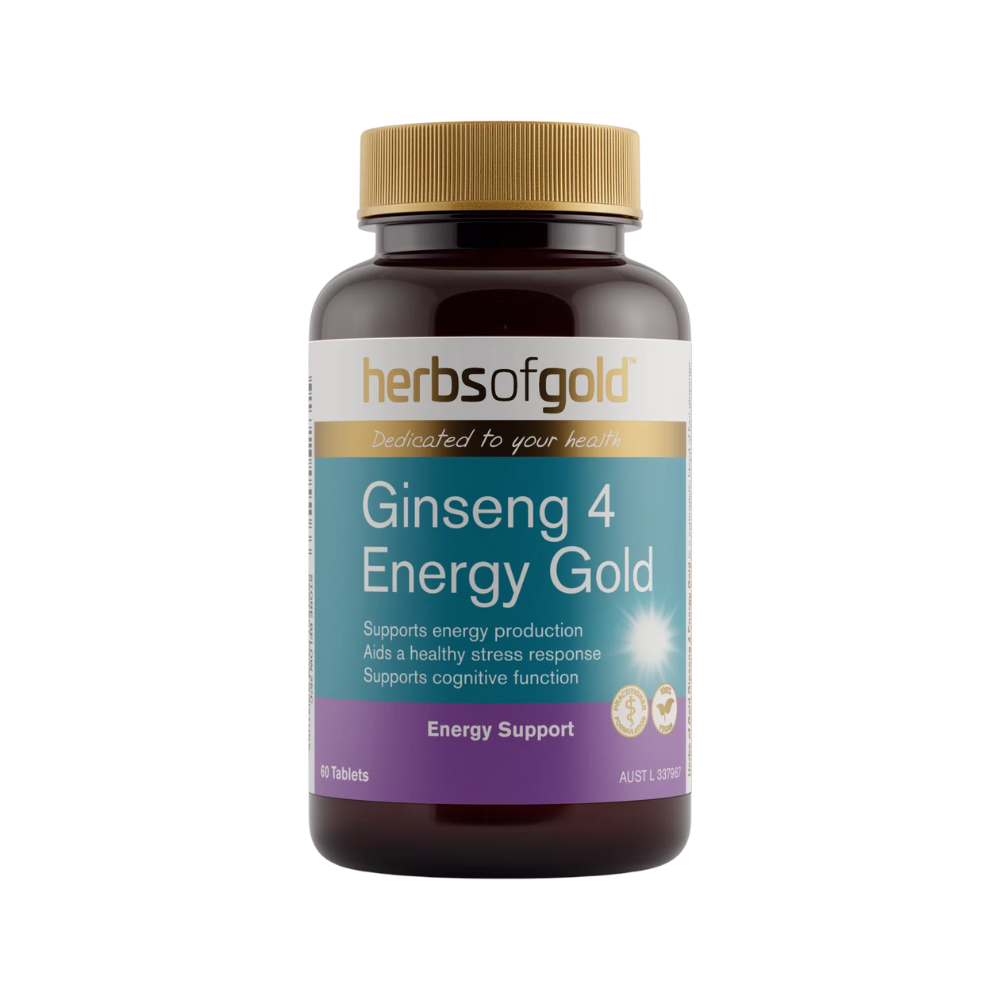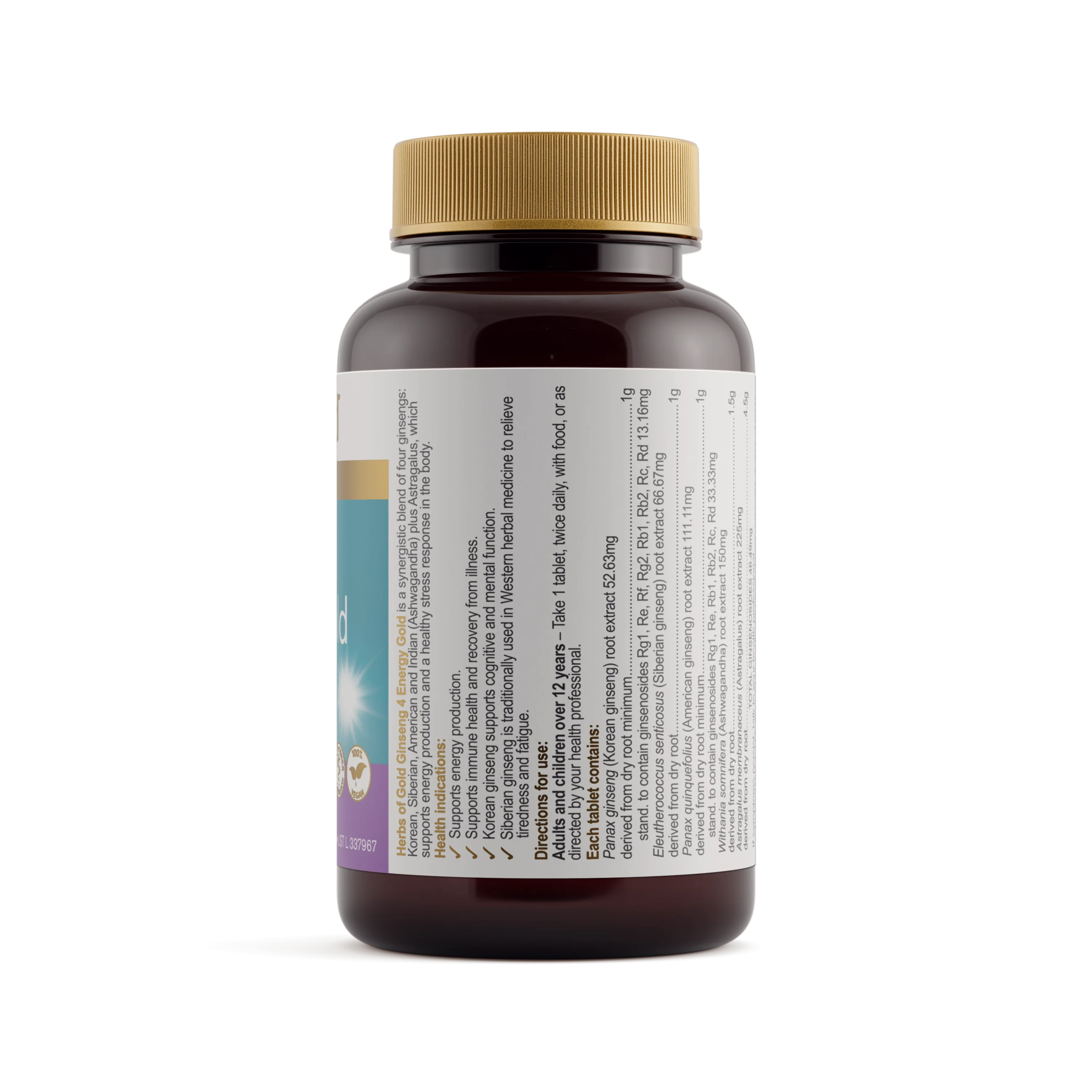 Herbs of Gold Ginseng 4 Energy Gold contains a synergistic blend of four ginsengs plus Astragalus to support energy production and a healthy stress response in the body.