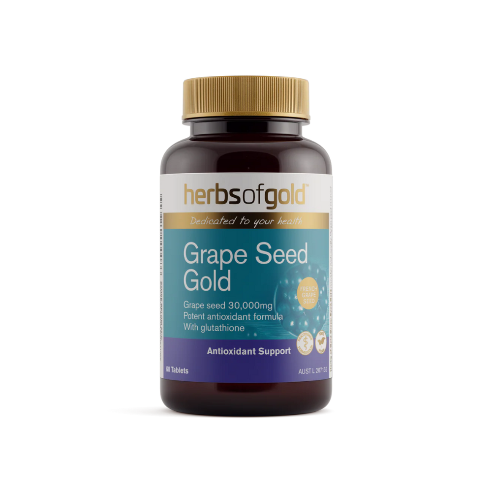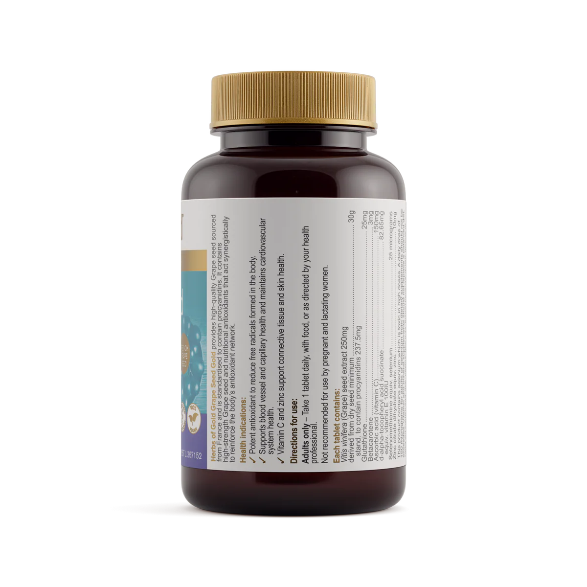Herbs of Gold Grape Seed Gold is a potent antioxidant formula combining a broad spectrum of nutrients and free radical scavengers to help reduce oxidative stress and strengthen the body’s antioxidant network. Each tablet provides 30g of grape seed extract, standardised to deliver 237.5mg of procyanidins (OPCs) for powerful antioxidant support. This formula promotes healthy vision, blood vessel and capillary health, and supports cardiovascular system function. Enriched with vitamin C and zinc, it also aids connective tissue production, collagen formation, skin health, and immune system function. Together, these ingredients work synergistically to protect cells from free radical damage and promote overall vitality.
