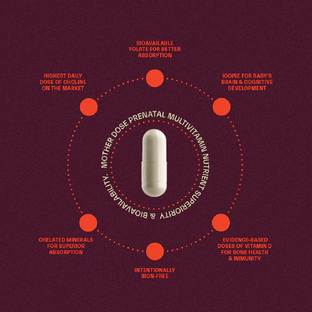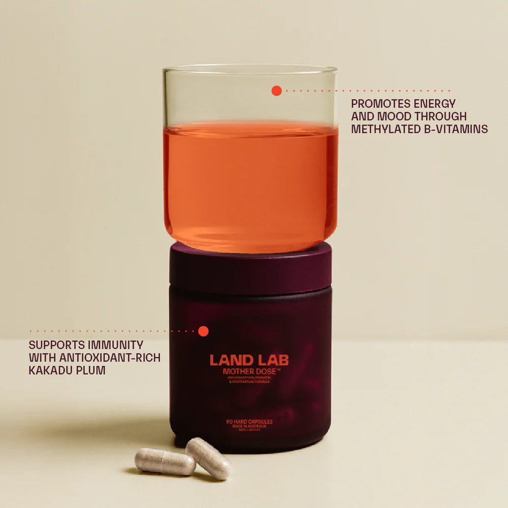 Land Lab Mother Dose™ is a comprehensive, evidence-based prenatal formula designed to support fertility, pregnancy, and postpartum recovery in one thoughtfully formulated blend. Developed by doctors, dietitians, and naturopaths, it delivers optimal forms and clinically relevant doses of essential nutrients—including 550 mg of choline, methylated B-vitamins, activated folate, iodine, and highly absorbable chelated minerals. The inclusion of 1.5 g of ginger extract helps reduce nausea and supports digestive comfort, making it gentle on the stomach.