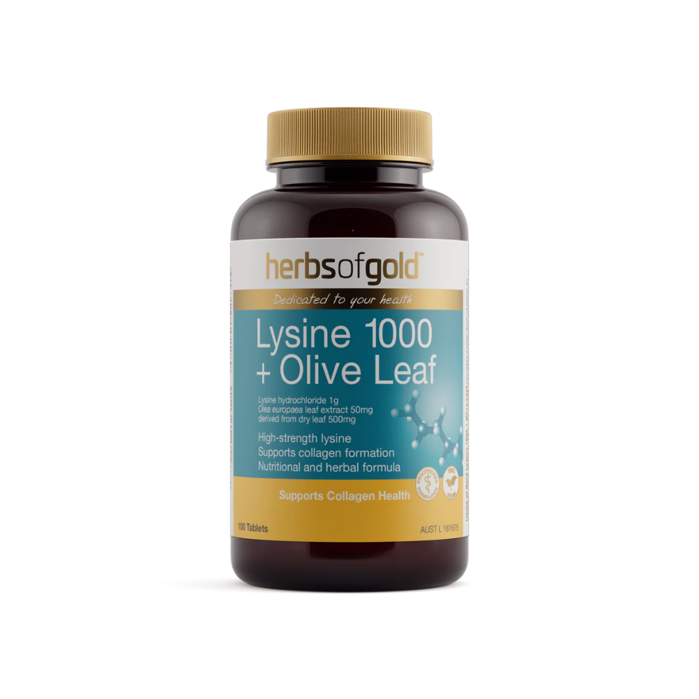Herbs of Gold Lysine 1000 + Olive Leaf combines 1000mg of the essential amino acid lysine with a standardised extract of olive leaf to support collagen formation and overall wellbeing. Lysine plays a vital role in maintaining collagen structure, supporting healthy skin, and promoting tissue repair. Olive leaf provides additional antioxidant support, helping to protect the body from free radical damage and maintain general health.