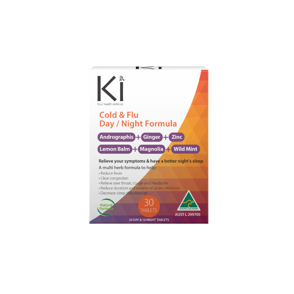 Ki Cold & Flu Day/Night Formula contains a combination of natural ingredients and clinically trialled Andrographis to help fight the symptoms of the common cold and flu. The additional night tablet provides relief from congestion and provides a restorative sleep.