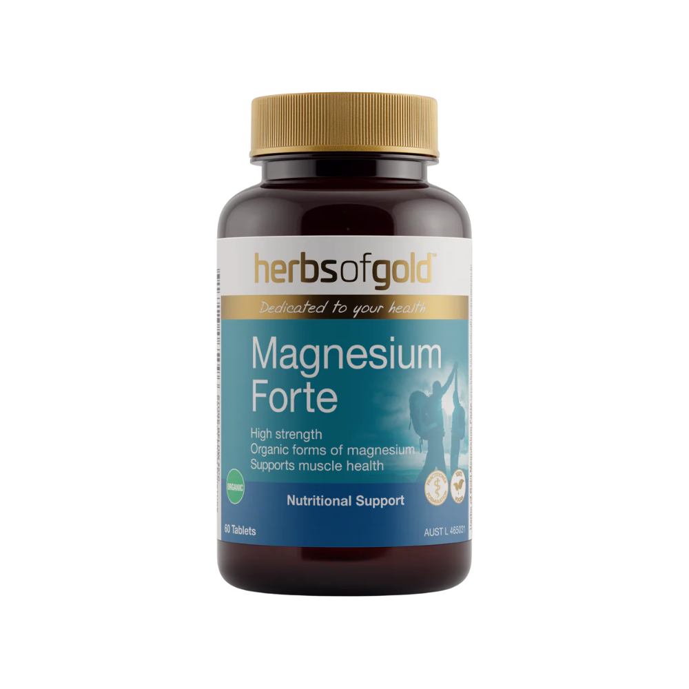 Herbs of Gold Magnesium Forte provides a high-strength blend of four well-absorbed organic forms of magnesium to support muscle function, bone health, and overall wellbeing. Magnesium plays a vital role in hundreds of enzymatic reactions in the body, assisting energy production, sugar metabolism, and muscle contraction. This comprehensive formula helps maintain heart health, supports a healthy stress response and nervous system function, and may help relieve premenstrual tension, menstrual cramps, and muscle cramps when dietary magnesium intake is inadequate. Magnesium Forte also supports a healthy pregnancy and helps prevent dietary magnesium deficiency.