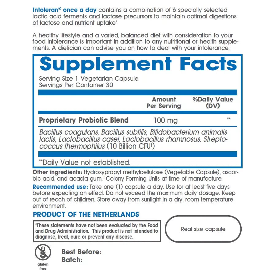 For Lactose Intolerance our Once-A-Day product is based on six probiotic lactase precursor strains, which assist production of the lactase enzyme. It is a different approach allowing for a once daily dose to allow digestion of lactose, without needing to take a supplement prior to each lactose containing meal or drink. A once a day dose with the first meal of the day provides day long coverage.