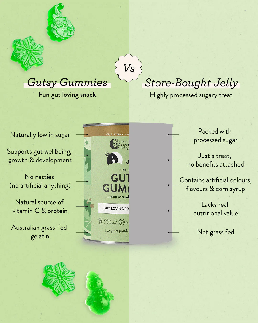 Gutsy Gummies Pine Lime is a naturally, low sugar snack to nourish kiddies and support their gut wellbeing. A fun & nutritious alternative to sugar-laden jellies and artificial gummies is finally here!