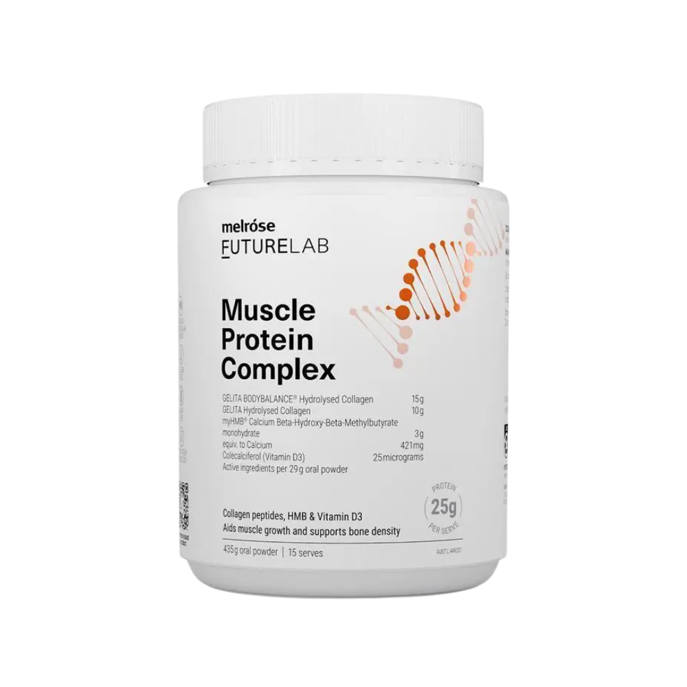 Melrose FutureLab Muscle Protein Complex offers a comprehensive blend containing 25 g of protein, including 15 g of the clinically trialed Gelita BodyBalance® Collagen peptides, as well as 10 g of Gelita PeptiPlus® Collagen Protein, which help maintain lean body mass in ageing individuals.Collagen is an important protein source, providing the nutrients required for the many processes that take place in muscles and cells.