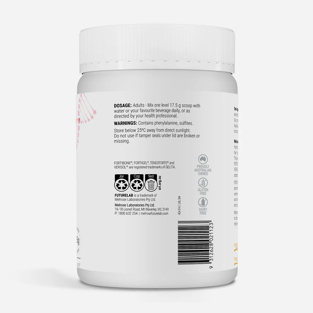 A premium, high-strength collagen supplement featuring four clinically studied peptides: FORTIGEL®, FORTIBONE®, TENDOFORTE® and VERISOL®, formulated to support skin elasticity, joint function, bone mass, nail strength and connective tissue health.