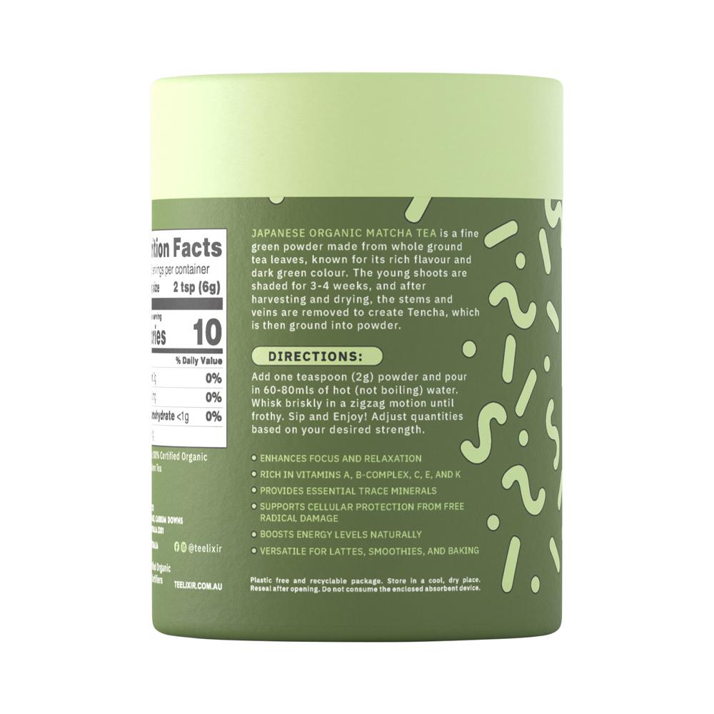 Teelixir Organic Matcha is a ceremonial-grade green tea powder crafted from a near 100-year Japanese family tradition. Sourced from the prestigious Shizuoka region and shade-grown for maximum nutrient density, this matcha delivers exceptional purity, flavour, and potency. Rich in antioxidants—up to 140x more than regular green tea—it provides calm, sustained energy, supports healthy ageing, nourishes skin and cellular health, and elevates daily wellness rituals. Sustainably produced and authentically crafted, it brings the ancient Japanese matcha tradition directly to your cup.