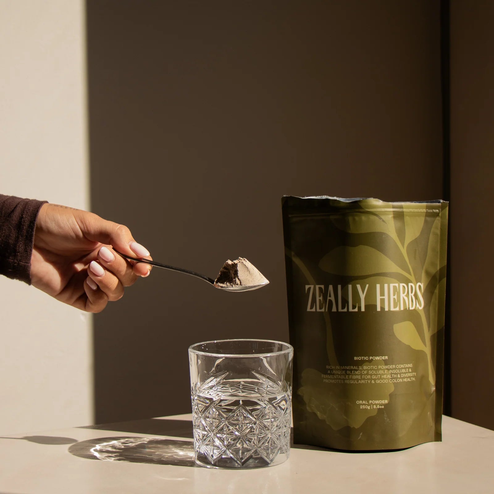 Zeally Herbs Biotic Powder is a daily gut-support blend designed to nourish digestion and support a healthy, balanced microbiome. Rich in fermentable, soluble, and insoluble fibre, it helps promote regular bowel movements while feeding beneficial gut bacteria. Cultivated using organic practices and naturally high in resistant starch, this prebiotic-rich powder supports smooth motility and overall digestive wellbeing. Easy to incorporate into smoothies, breakfast bowls, or baking, it’s ideal for everyday gut maintenance or for rebuilding digestive health after completing a cleanse.